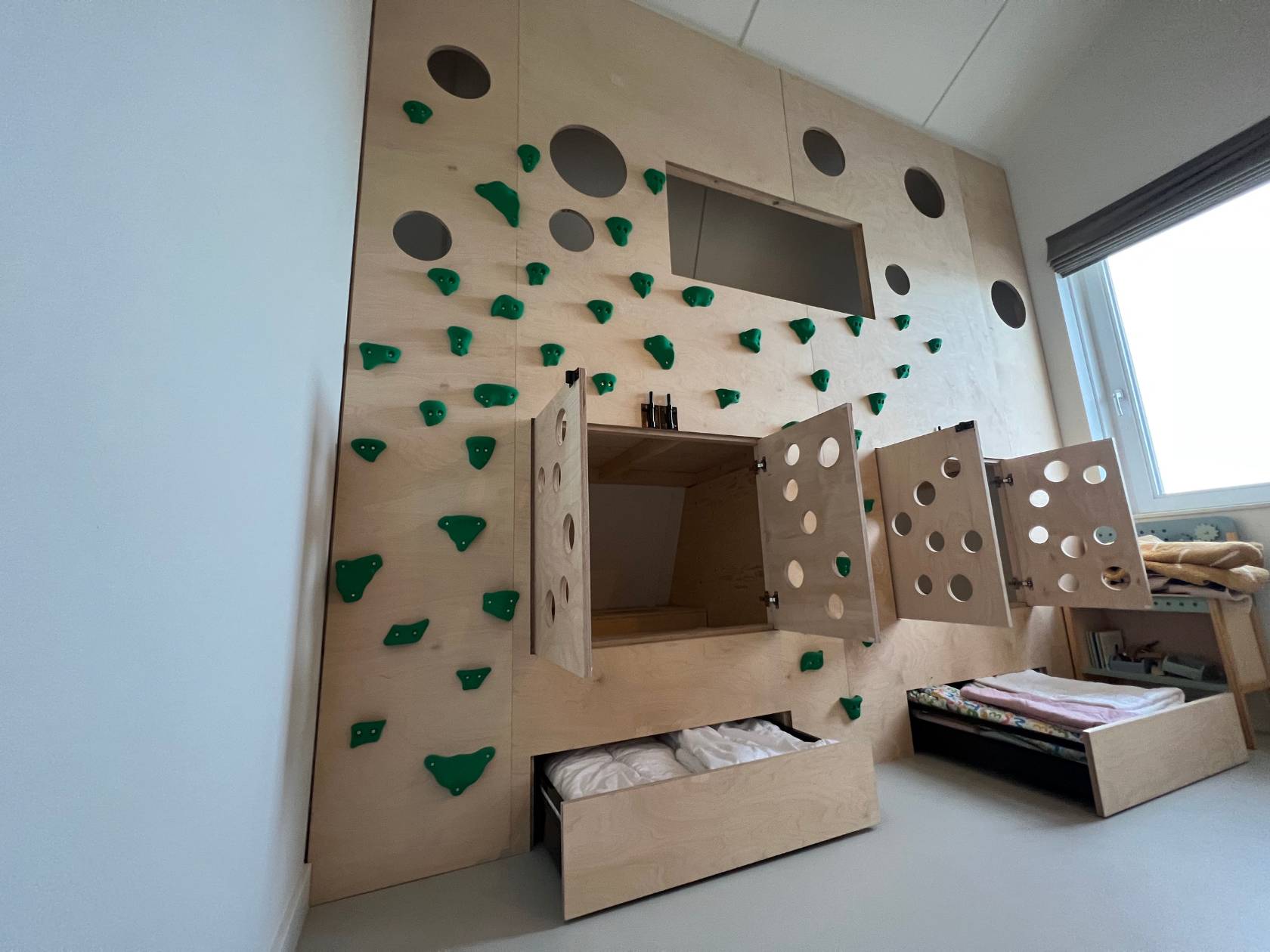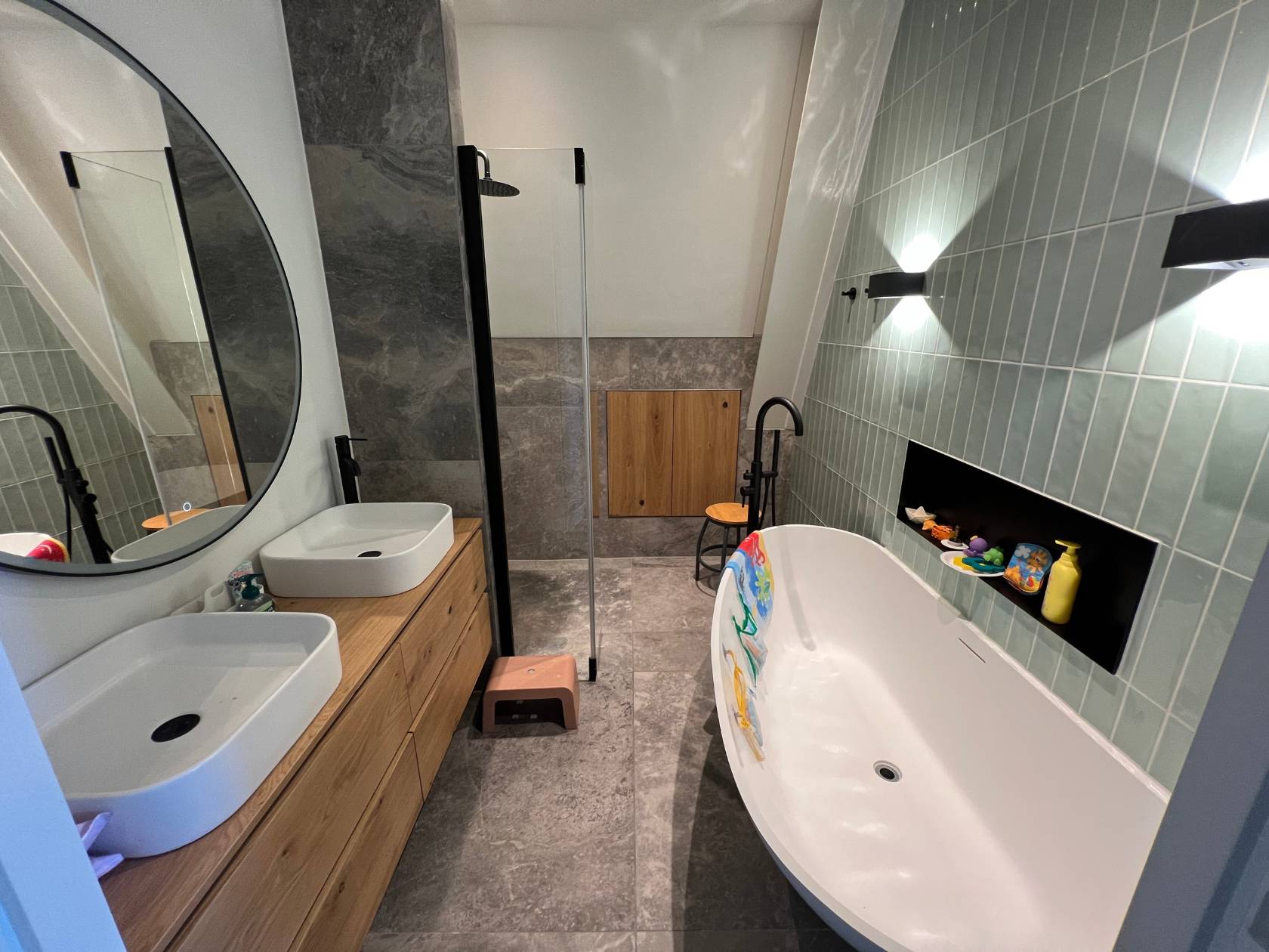 In Muiden verzorgden we een veelzijdige woningrenovatie waarbij functionaliteit, creativiteit en esthetiek samenkomen. Van een op maat gemaakte kinderklimwand tot een stijlvolle badkamer met modern tegelwerk: elk onderdeel is met zorg ontworpen en uitgevoerd.